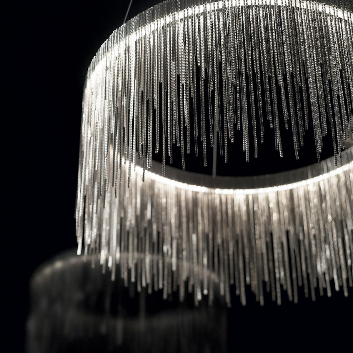 Eine moderne und elegante Lampenserie. Verchromter Metallrahmen, in dem LED-Quellen integriert sind. Dekorative Behänge aus quadratisch geflochtenen Metallketten. Die Kronleuchter haben…
