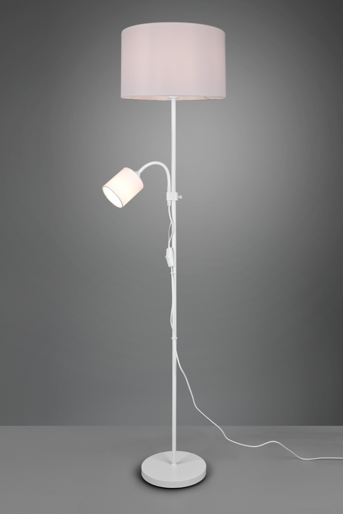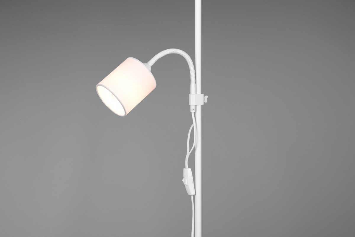 Trio Owen Stehlampe wird Ihnen helfen, Ihren Lieblingsplatz in Ihrem Wohnzimmer, Schlafzimmer oder sogar in Ihrem Büro aufzuhellen. Die Leuchte hat eine weiße Metallstruktur und enthält insgesamt 2 Lampenschirme, die aus weißem Textil bestehen. Darüber hinaus ist der kleinere Schirm mit einem